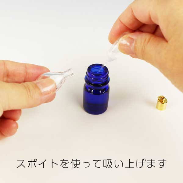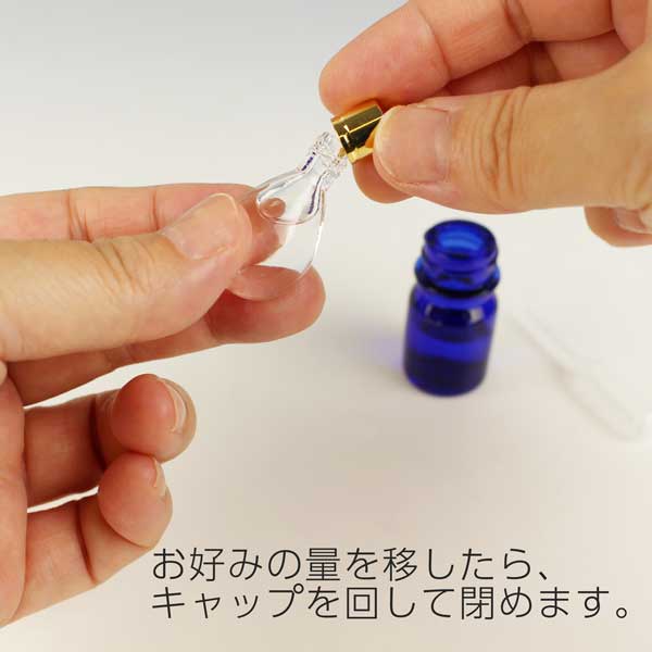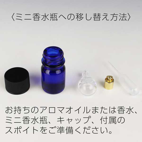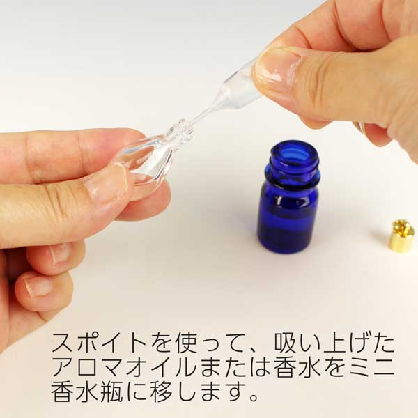 ミニ香水瓶にはお気に入りの香りを入れてください。休憩中や移動の合間にサッとお気に入りの香りをかげば、ちょっと疲れていても、イライラや不安があっても、心が落ち着きいつもの自分に戻れます。お守りとして持っているのもいいですね。専用のスポイトがついていますのですぐにお使いいただけます。